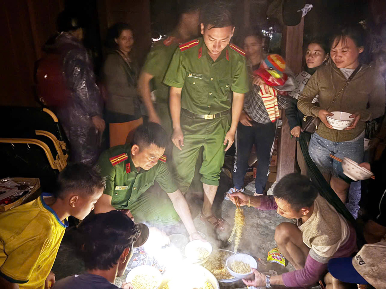 Giữa trời mưa xối xả, gió lạnh cắt da, hình ảnh những cán bộ, chiến sĩ Công an xã Trà Leng cùng nhau nhóm bếp, nấu những nồi mì ăn liền nóng hổi, chia từng bát mì cho bà con tránh trú sạt lở.