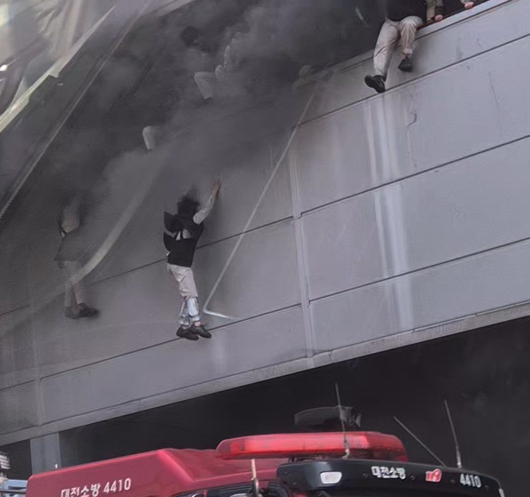 Các công nhân nhảy khỏi tòa nhà để thoát thân sau khi hỏa hoạn bùng phát - Ảnh: YONHAP