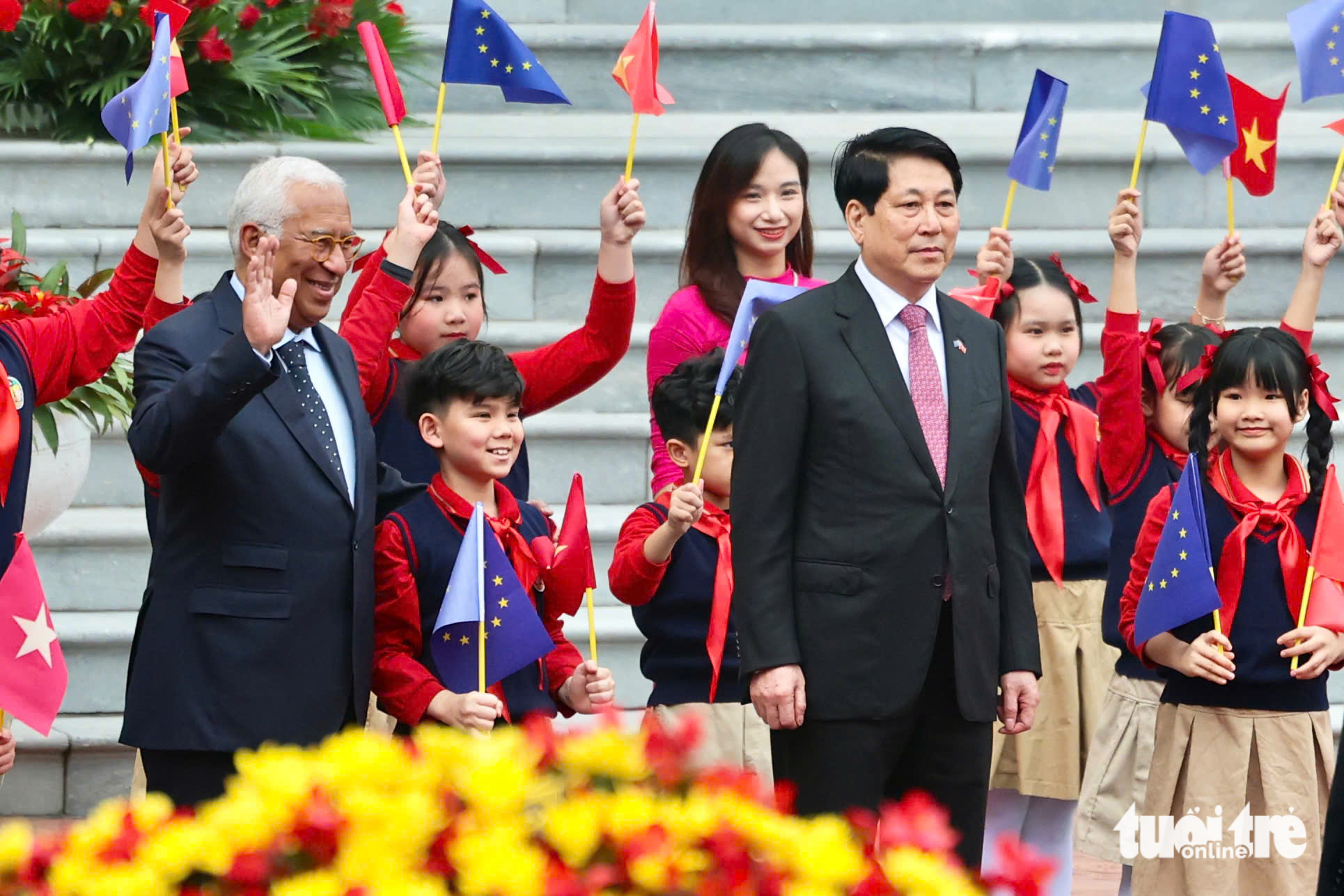 Thiếu nhi thủ đô vẫy cờ chào đón Chủ tịch Hội đồng châu Âu António Costa - Ảnh: NGUYỄN KHÁNH