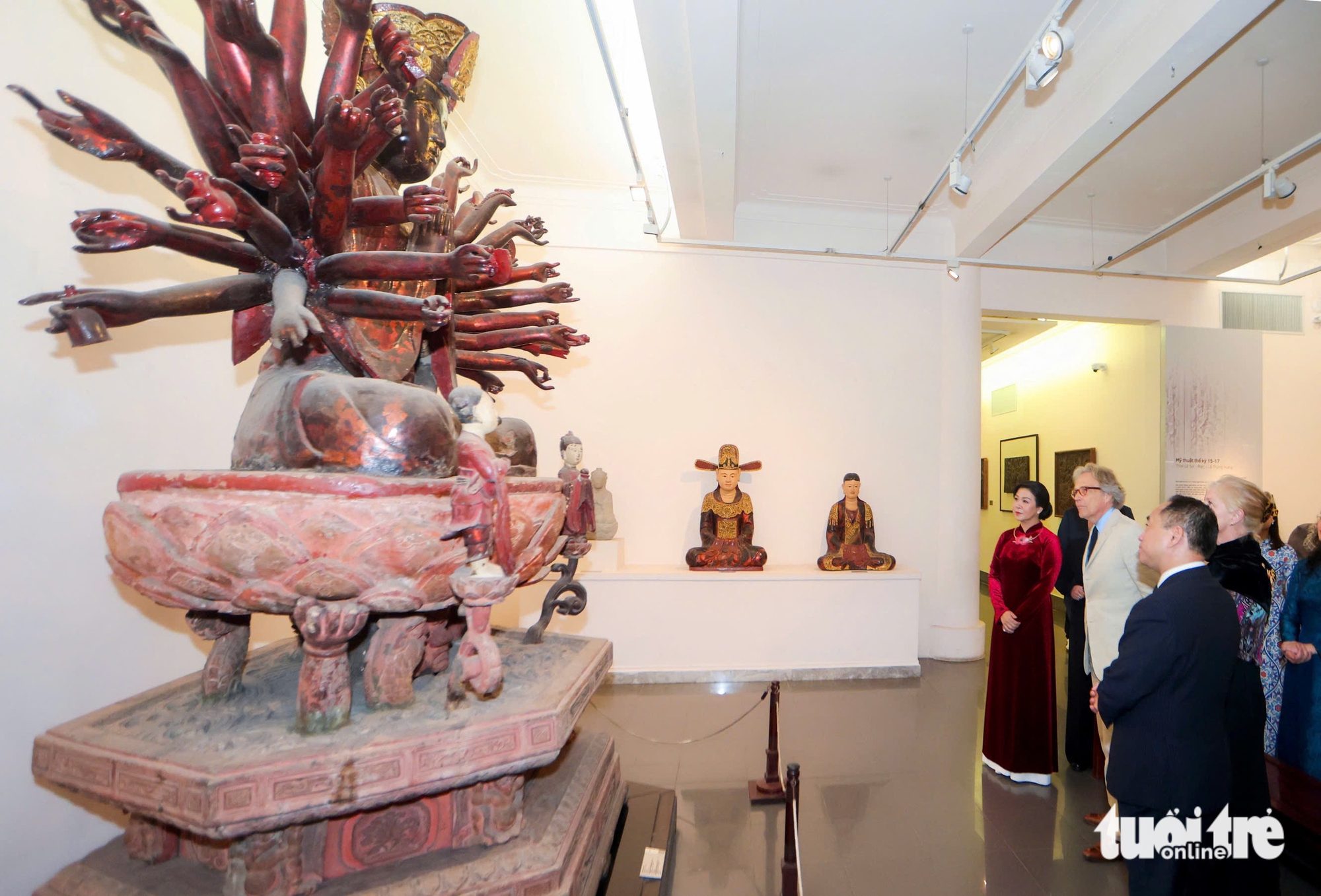 Trong không gian của những sắc màu, mang hơi thở các thời kỳ lịch sử của nền mỹ thuật Việt Nam, Phu nhân Ngô Phương Ly cùng Ngài Công tước và Phu nhân đã lần lượt tham quan, nghe giới thiệu về một số bảo vật quốc gia được trưng bày tại bảo tàng.