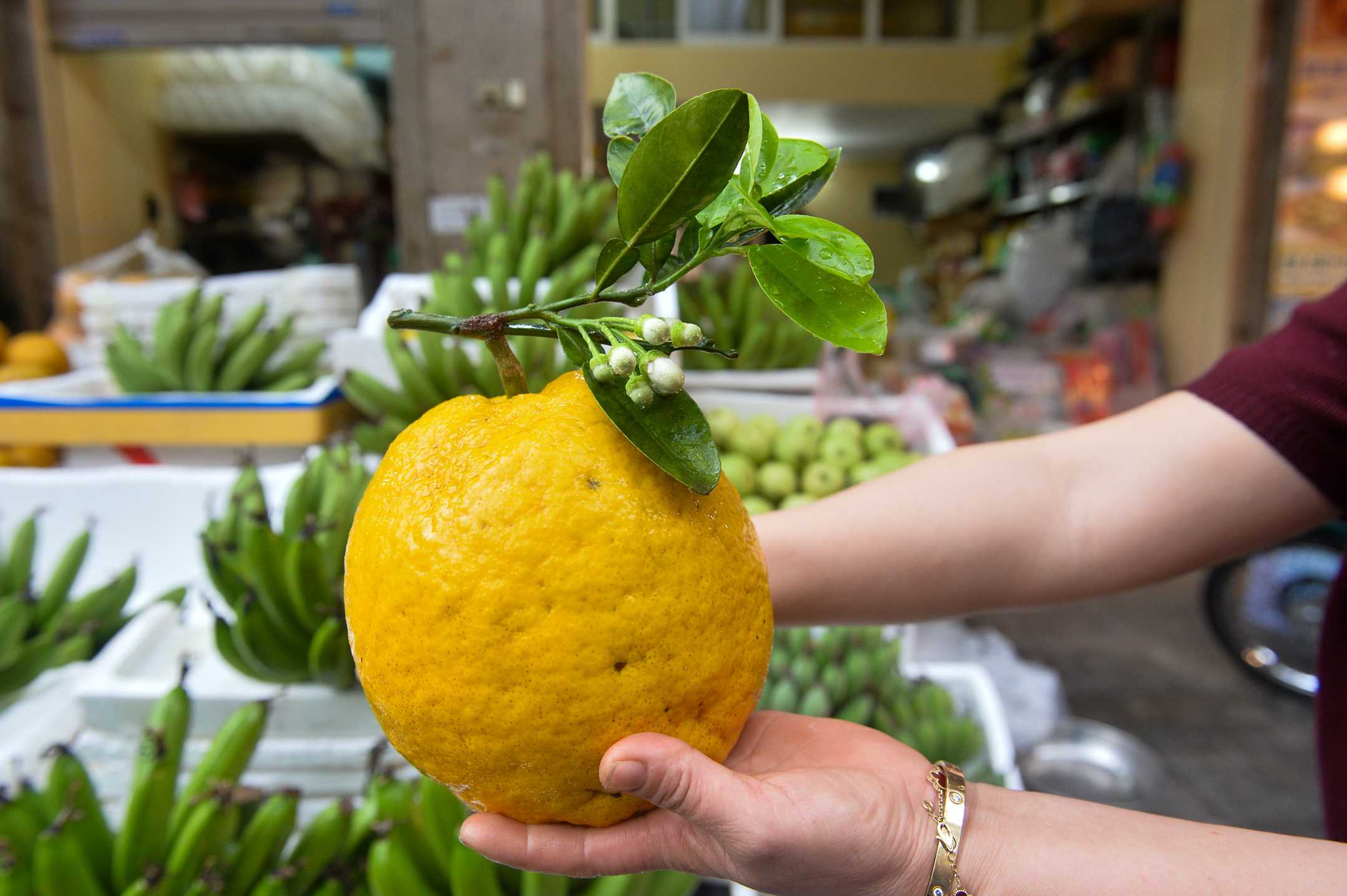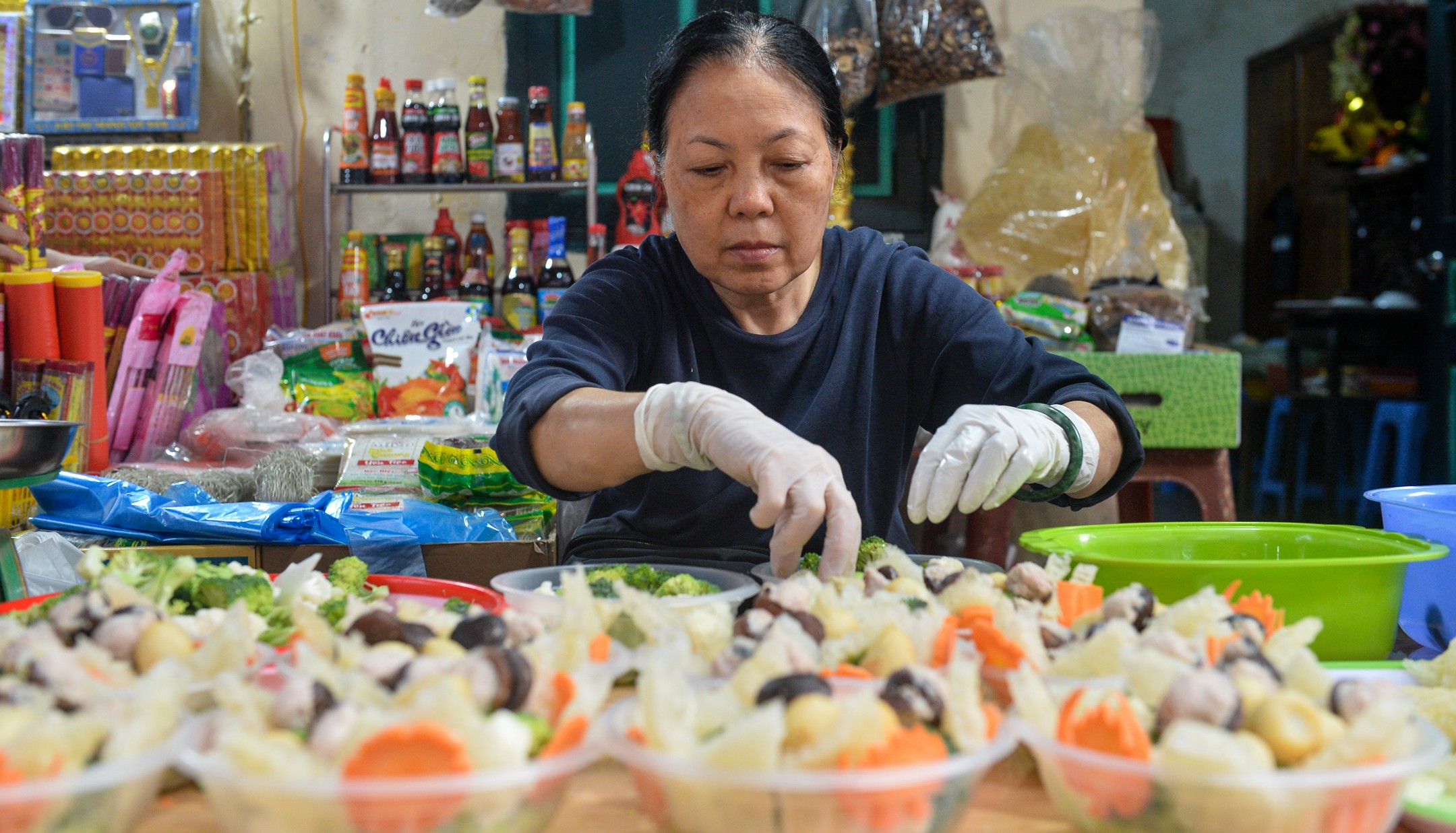 Xôi gấc, bưởi, canh bóng... là những mặt hàng được người dân chọn mua cho mâm cỗ giao thừa - Ảnh: PHÚC TÀI
