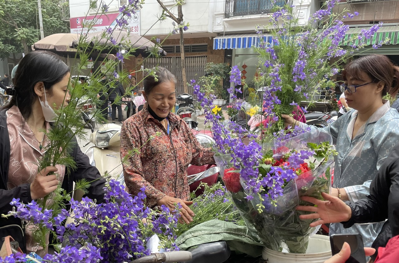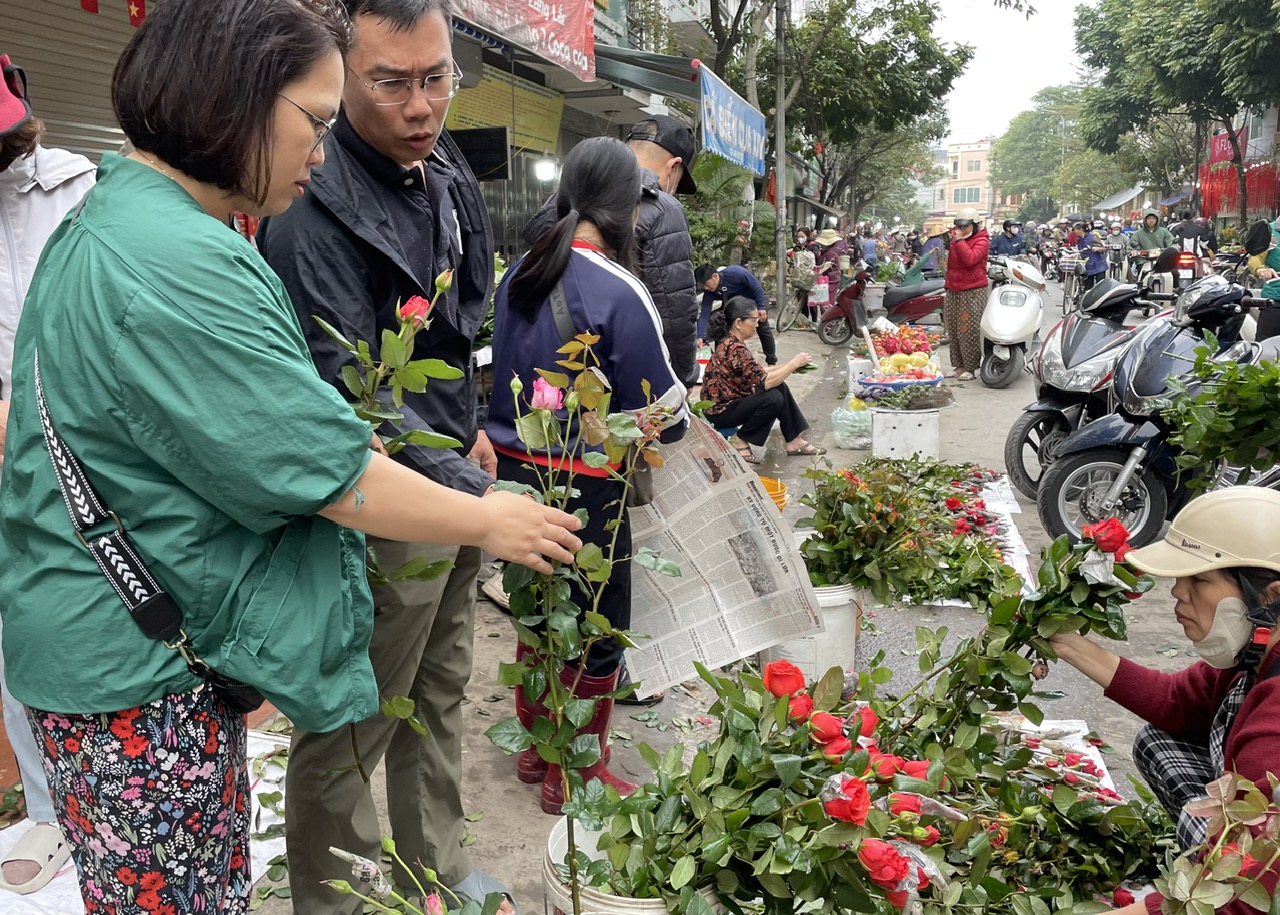 Tại các cửa hàng hoa tươi, người mua chen chân để chọn lựa những bó hoa đẹp, ưng ý nhất để cắm bàn thờ và trang trí nhà cửa trong ngày Tết. Hoa hồng, violet, thược dược, lay ơn… được tiêu thụ mạnh nhất.
