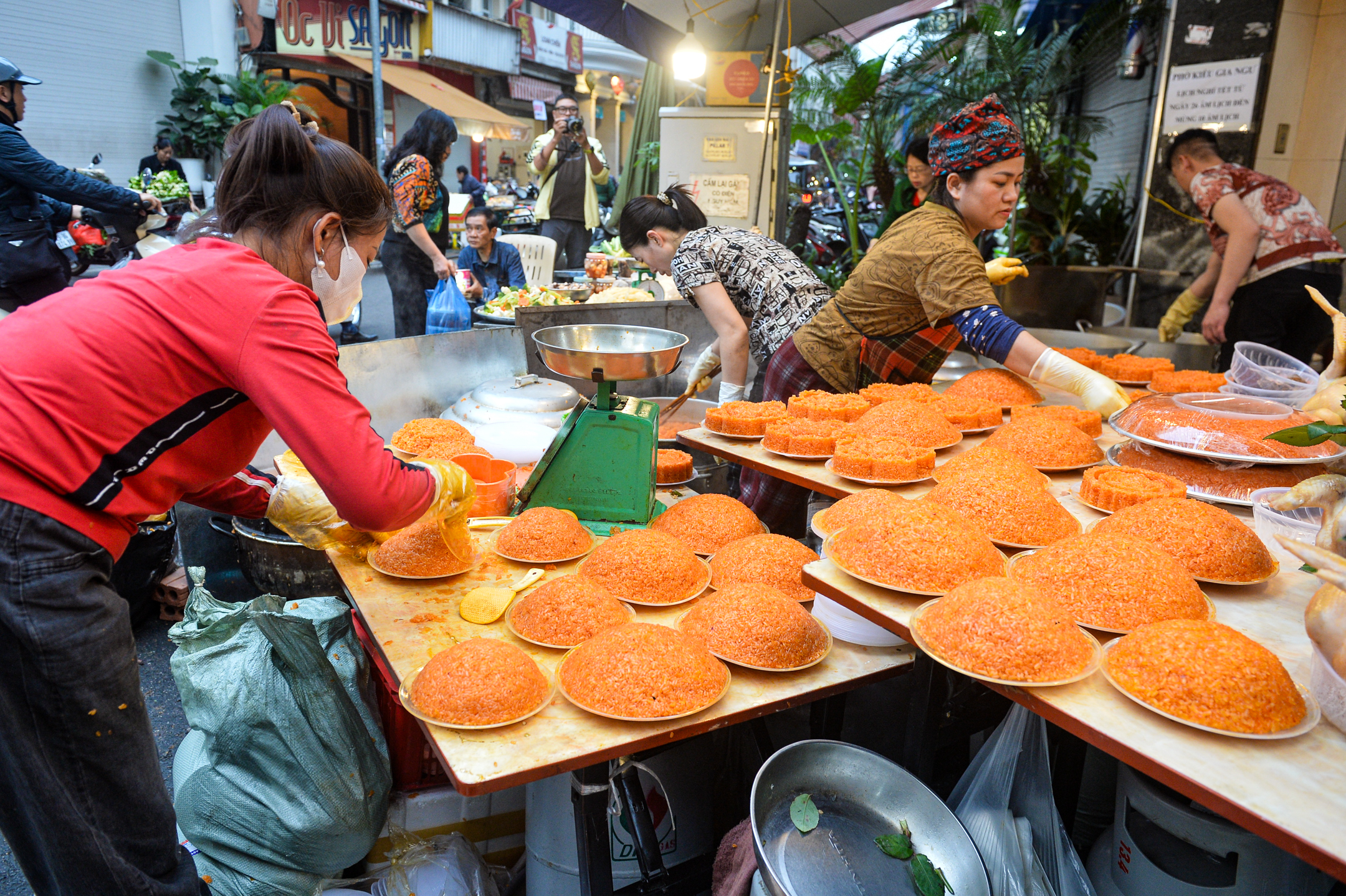 Ngoài gà lễ, nhiều mặt hàng phục vụ mâm cỗ tất nhiên cũng đắt khách. Xôi gấc có giá từ 60.000 đồng đến hơn 100.000 đồng/đĩa tùy kích cỡ; canh bóng 70.000 đồng/bát; bưởi lễ 100.000 - 150.000 đồng/quả; cau lễ khoảng 50.000 đồng/quả.