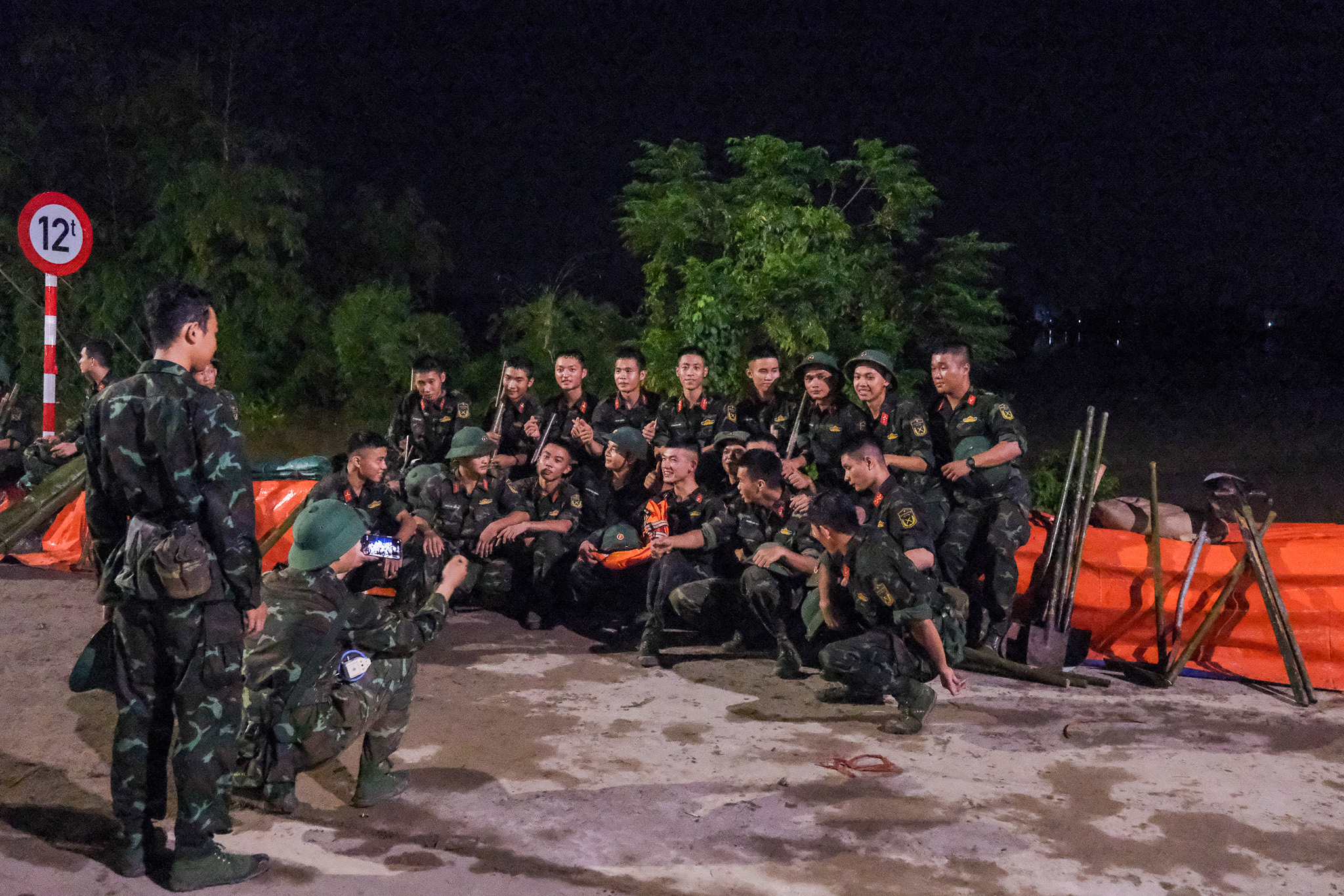 Nhiều cán bộ chiến sĩ thuộc lực lượng vũ trang làm việc đến đêm muộn để đảm bảo gia cố khép kín các đoạn xung yếu trên đê Đẩu Hàn giáp sông Cầu - Ảnh: HÀ QUÂN