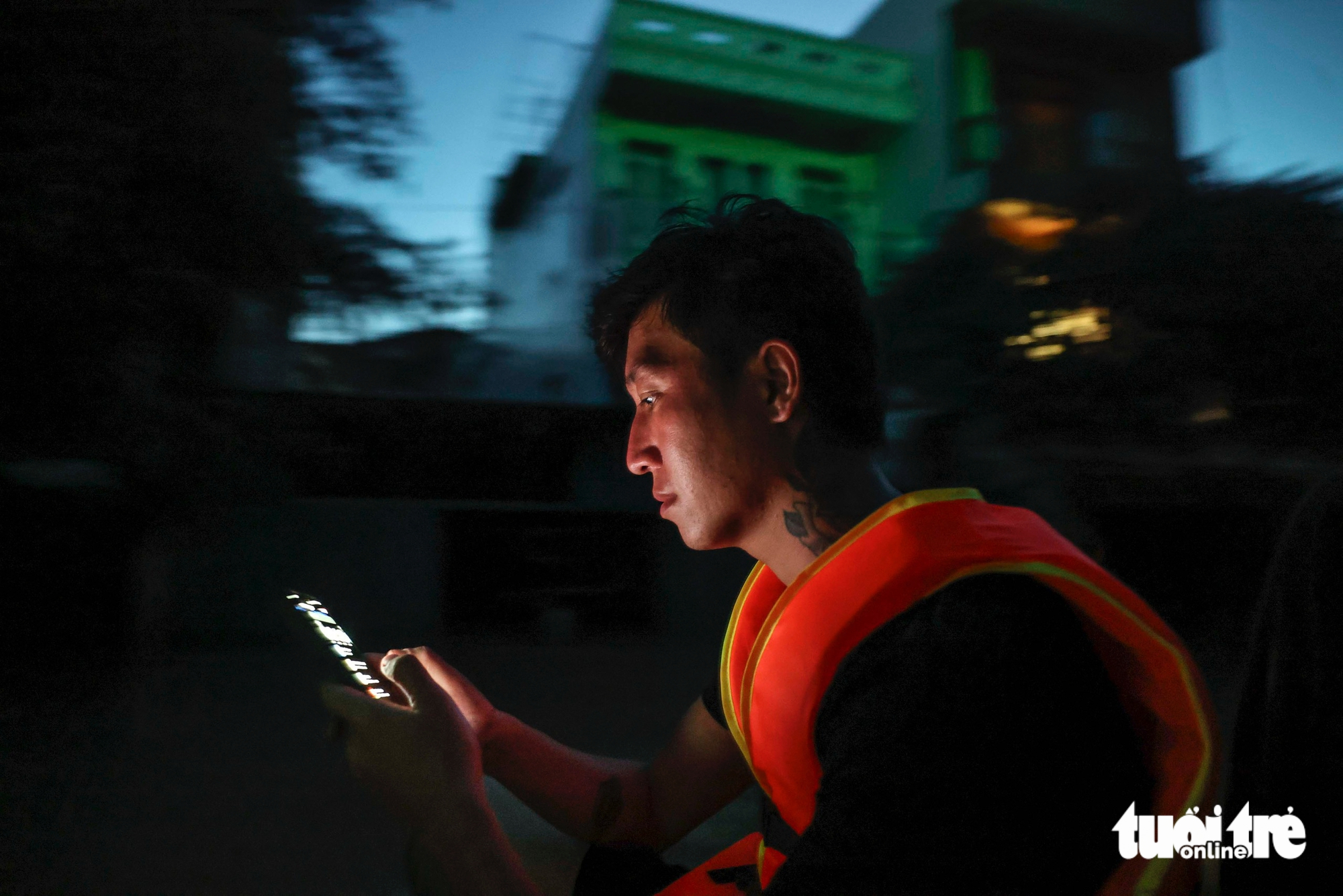 Nguyễn Anh Tú đang kiểm tra các tin nhắn cần cứu trợ để chủ động di chuyển ứng cứu người dân - Ảnh: NGUYỄN KHÁNH