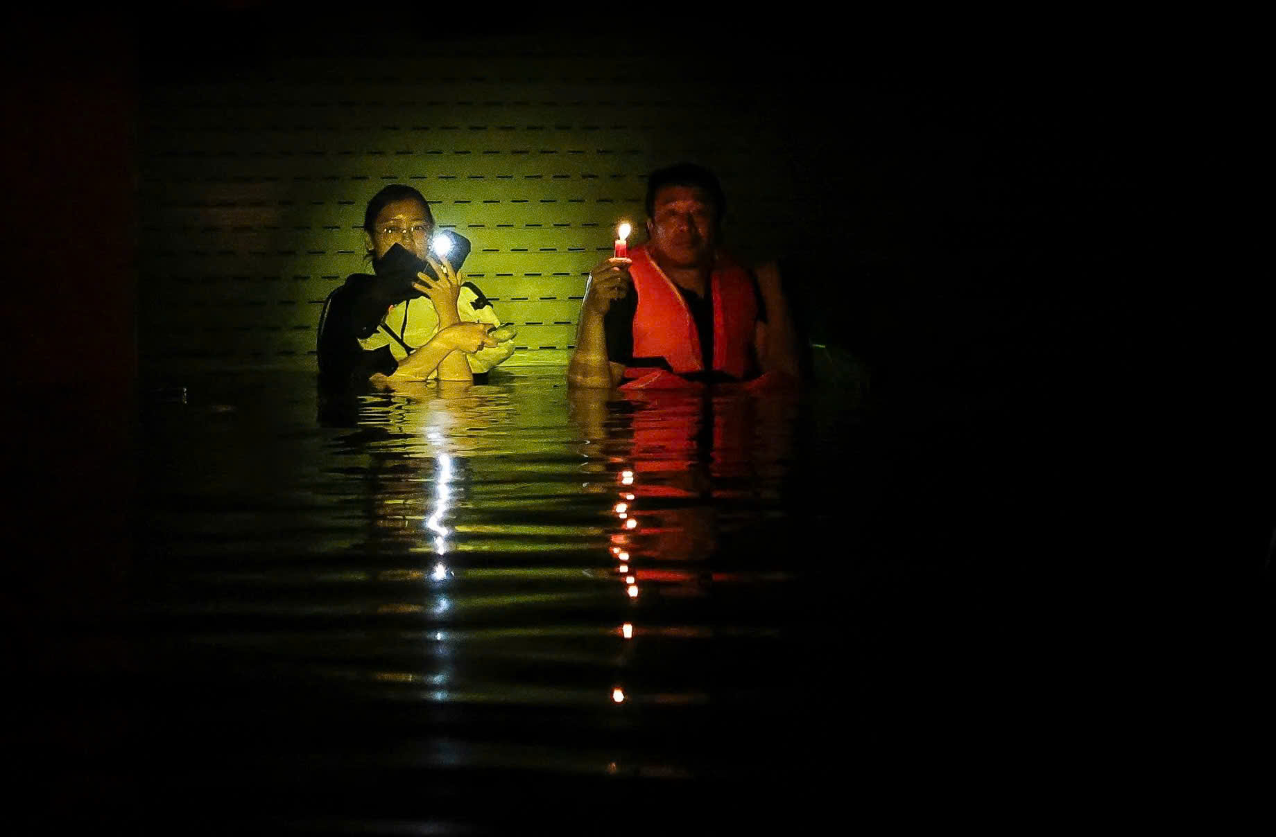 9h tối 8-10, nhiều khu vực tại trung tâm thành phố Thái Nguyên còn ngập sâu, có nơi gần 3m. Trong ảnh, nhóm tình nguyện đang đưa một người dân lên thuyền - Ảnh: NGUYỄN KHÁNH