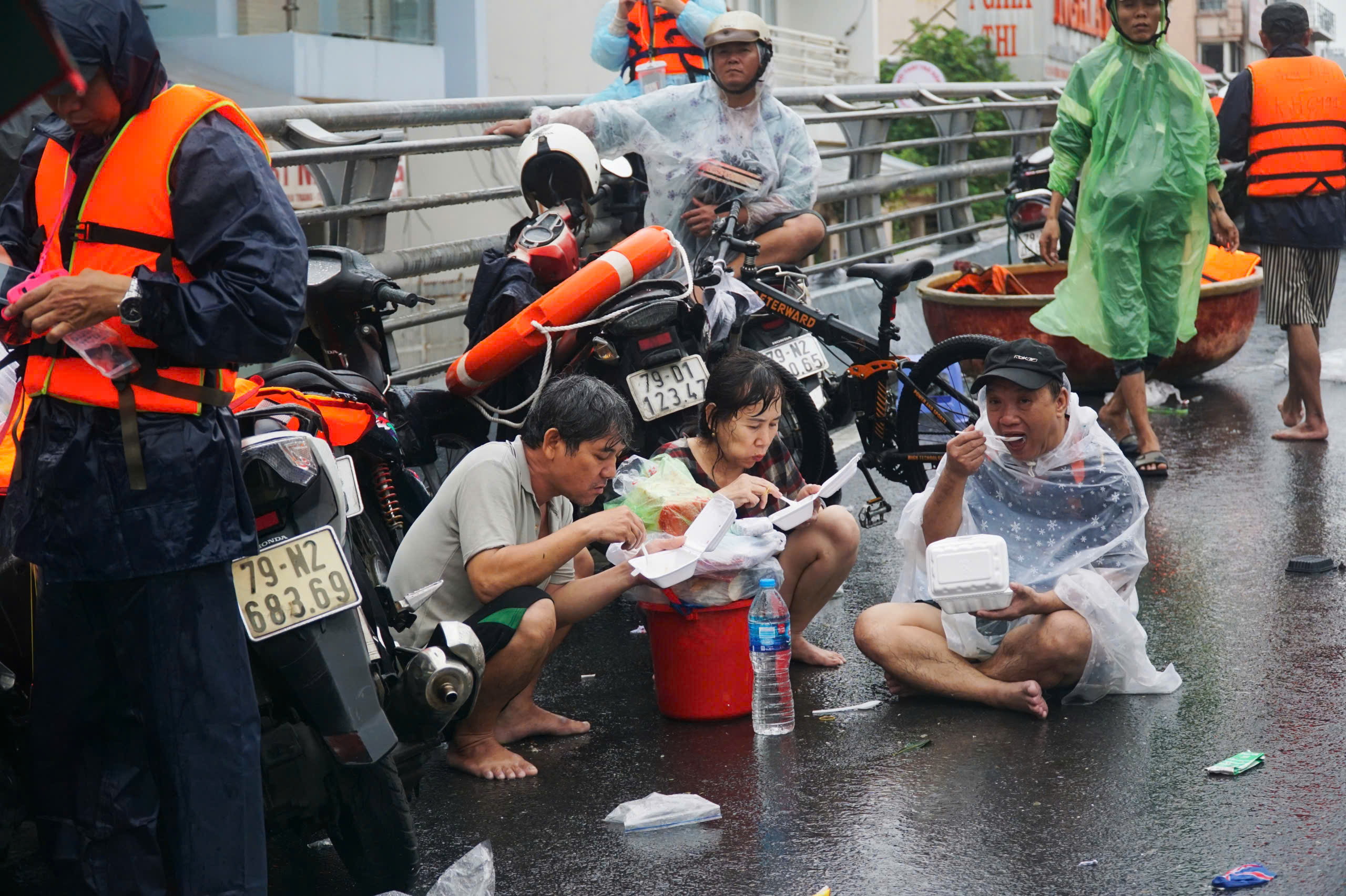 Bữa ăn vội của người dân ở Khánh Hòa sau khi được cứu, nhiều người đã không ăn uống từ chiều 19-11 - Ảnh: TRẦN HOÀI