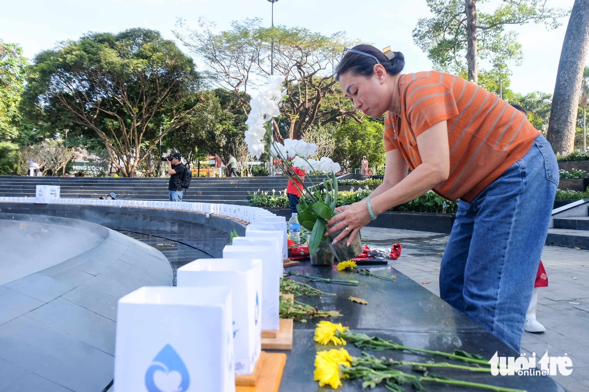 Chị Khôi Nguyên (50 tuổi, ngụ phường Tân Thuận) đặt một cành lan trắng tại khu vực đặt hoa tưởng nhớ xung quanh tượng đài giọt nước