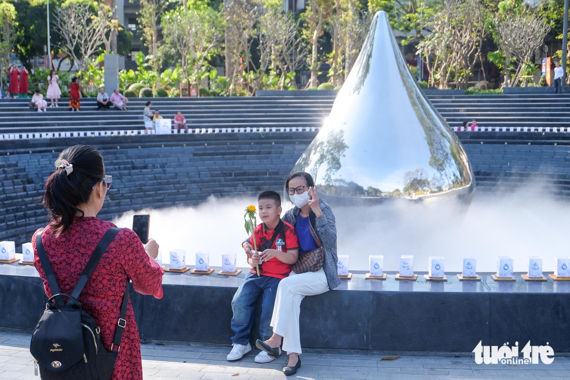Mùng 1 Tết, nhiều người dân lựa chọn đến công viên số 1 Lý Thái Tổ để tham quan, chụp ảnh cùng tượng đài giọt nước với thiết kế độc đáo và mang nhiều ý nghĩa