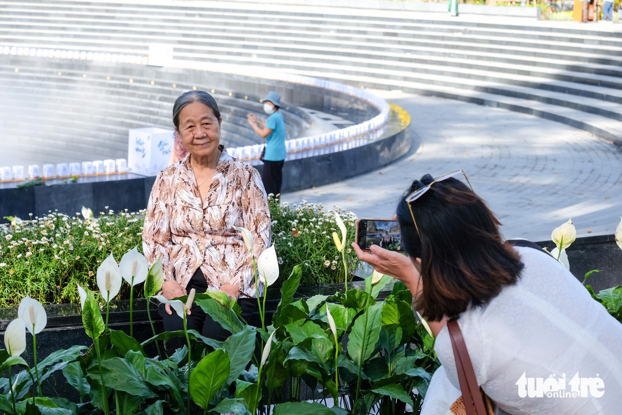 Còn tại công viên số 1 Lý Thái Tổ (phường Vườn Lài), từ sáng sớm đã có đông người dân đến tham quan. Ở khu vực tượng đài giọt nước, chị Khôi Nguyên (50 tuổi, ngụ phường Tân Thuận) nhẹ nhàng đặt một cành lan trắng tại nơi đặt hoa tưởng nhớ.