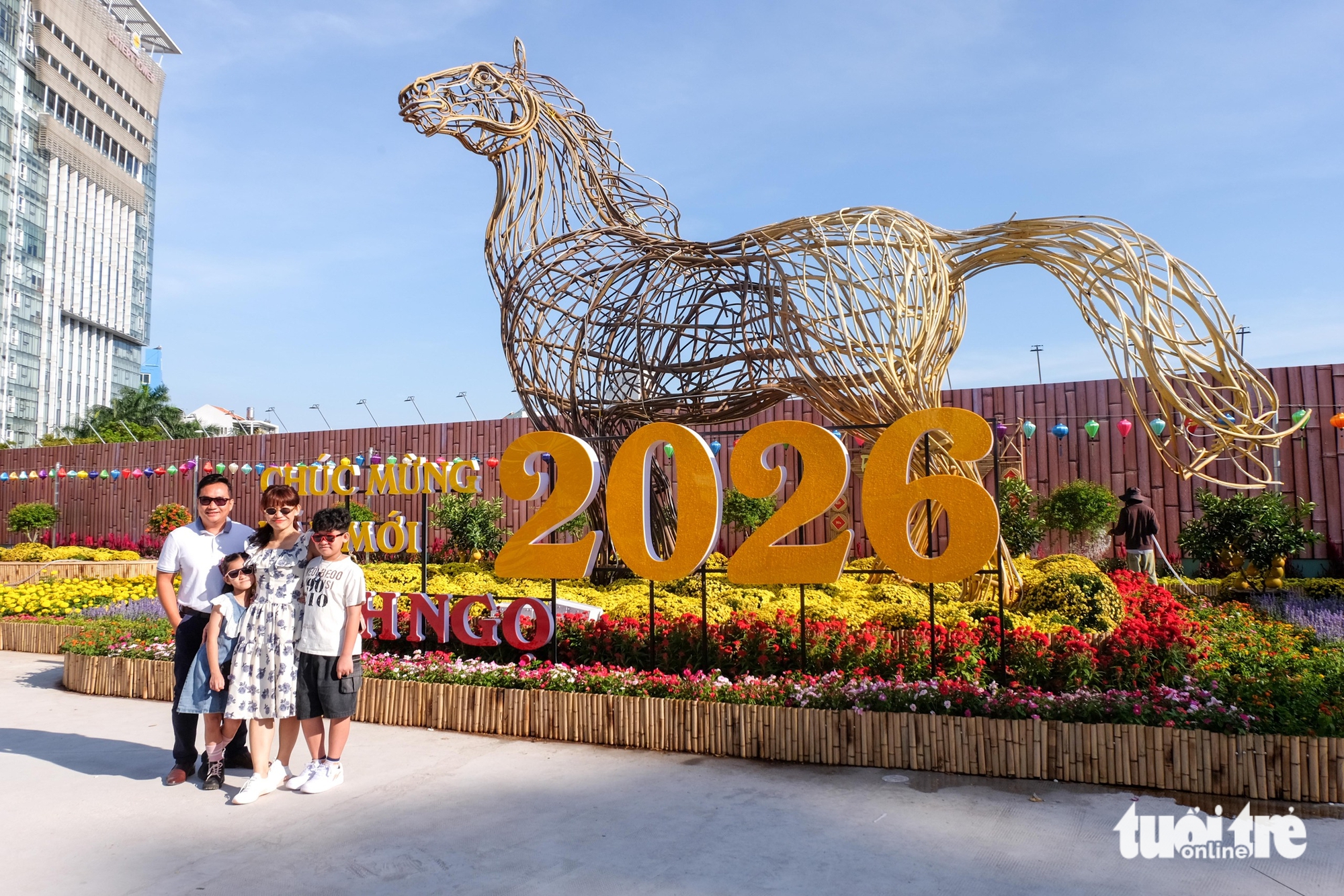 Gia đình chị Phương Uyên (41 tuổi) check-in cùng linh vật ngựa 2026 tại công viên 152 Trần Phú