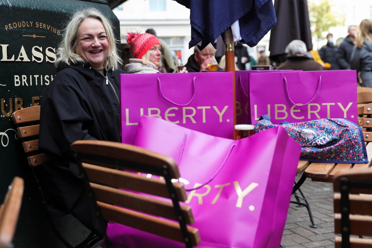 Người mua xách túi lớn túi nhỏ ra khỏi các cửa hàng thời trang ở trung tâm thành phố Liverpool (Anh). Ảnh: PA