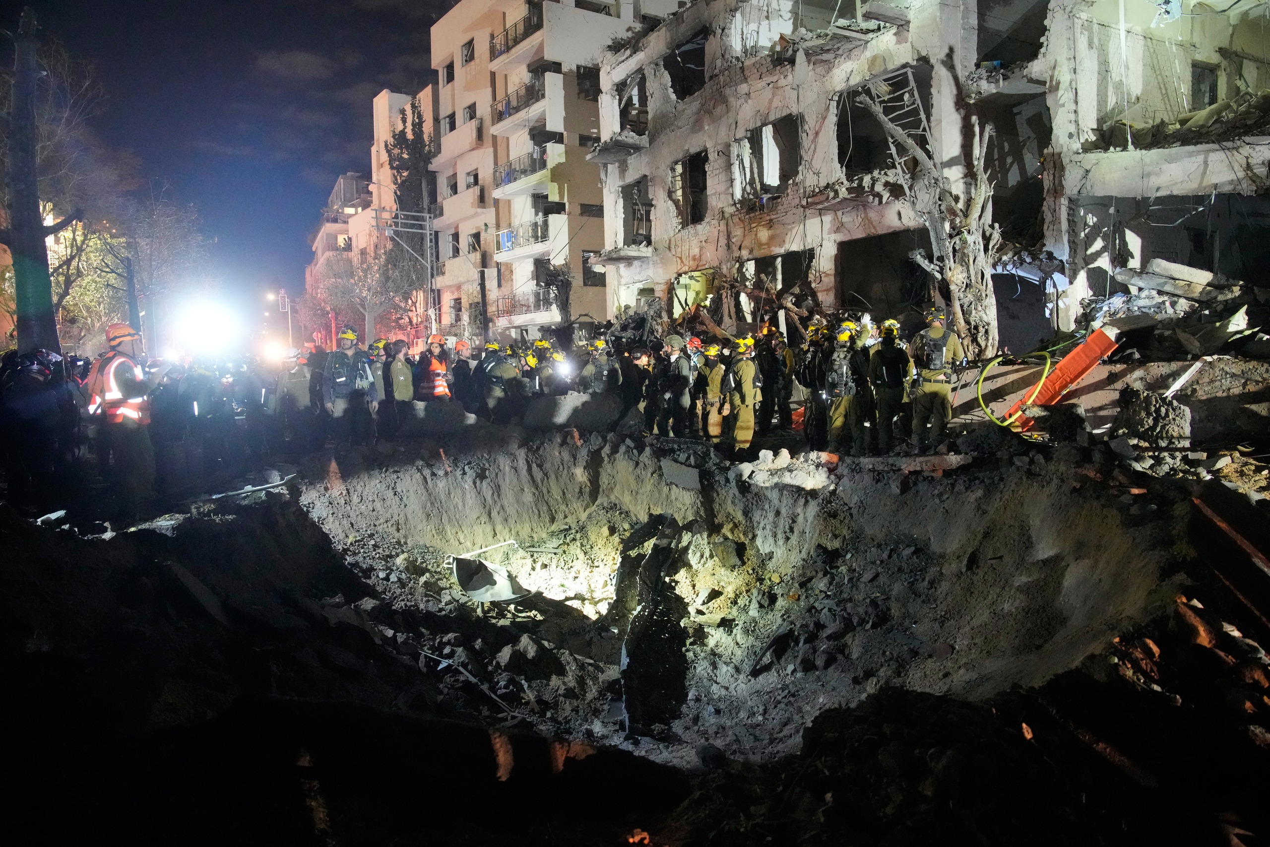Các sĩ quan thuộc Bộ Chỉ huy Mặt trận Nội địa của Israel tìm kiếm trong đống đổ nát của một tòa nhà chung cư bị hư hại sau cuộc tấn công bằng tên lửa của Iran, tại Tel Aviv, Israel, vào sáng sớm ngày 1-3 - Ảnh: AP
