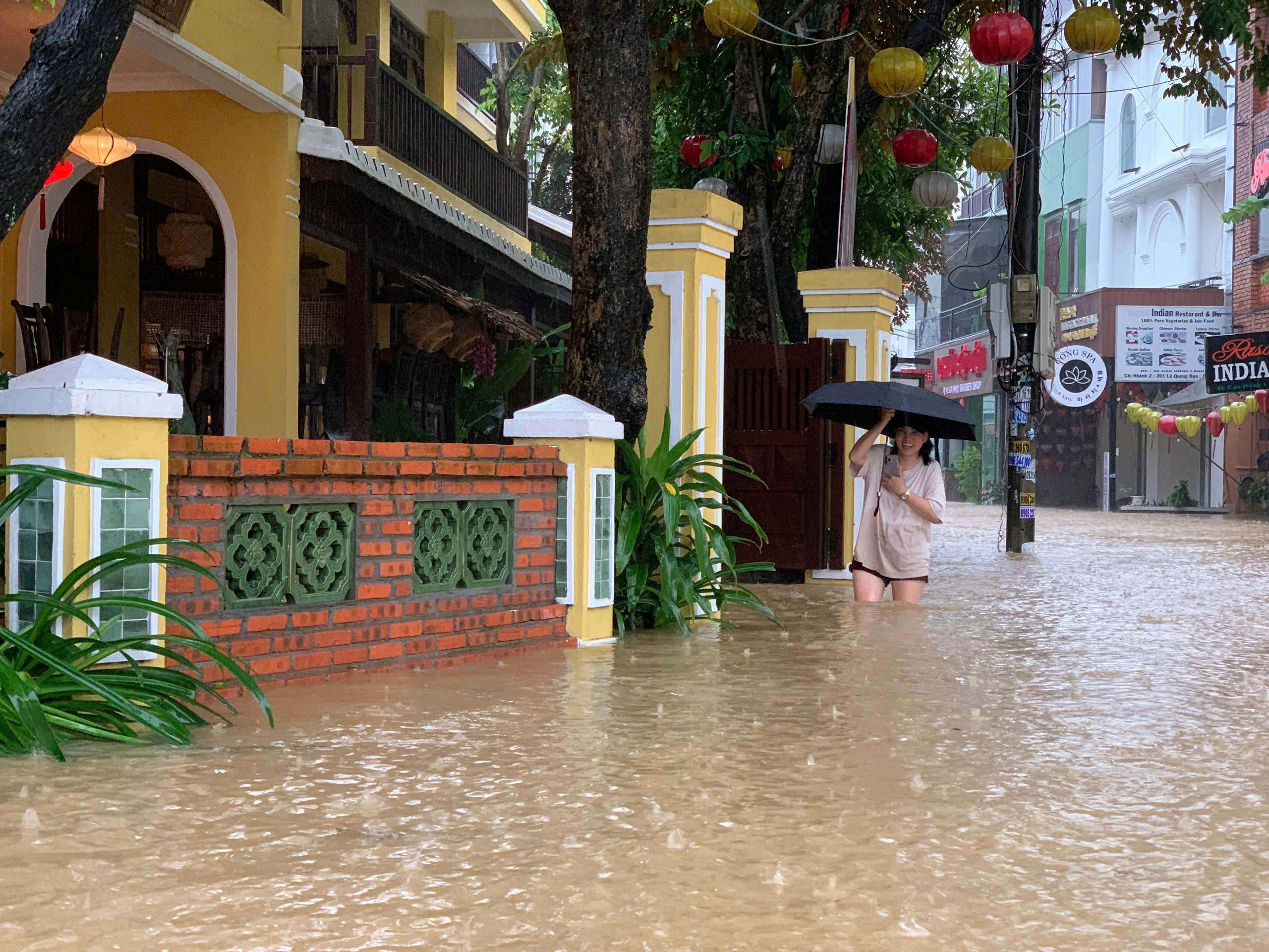 Từ đêm đến rạng sáng 27-10, nước lũ tiếp tục dâng nhanh khiến nhiều khu vực trong phố cổ Hội An bị ngập sâu. Nhiều hộ dân tại các tuyến phố trung tâm Hội An như Bạch Đằng, Nguyễn Thái Học, Nguyễn Phúc Chu… bị nước lũ tràn vào, có nơi ngập chạm tầng hai.