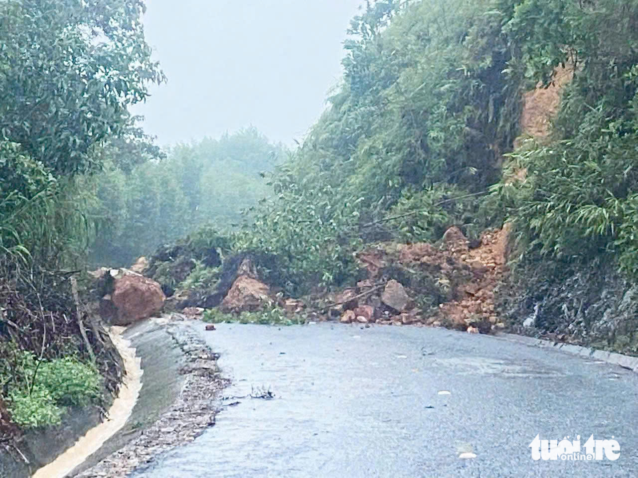 Đất đá tràn xuống mặt đường, giao thông bị chia cắt - Ảnh: PHƯƠNG ĐÔNG