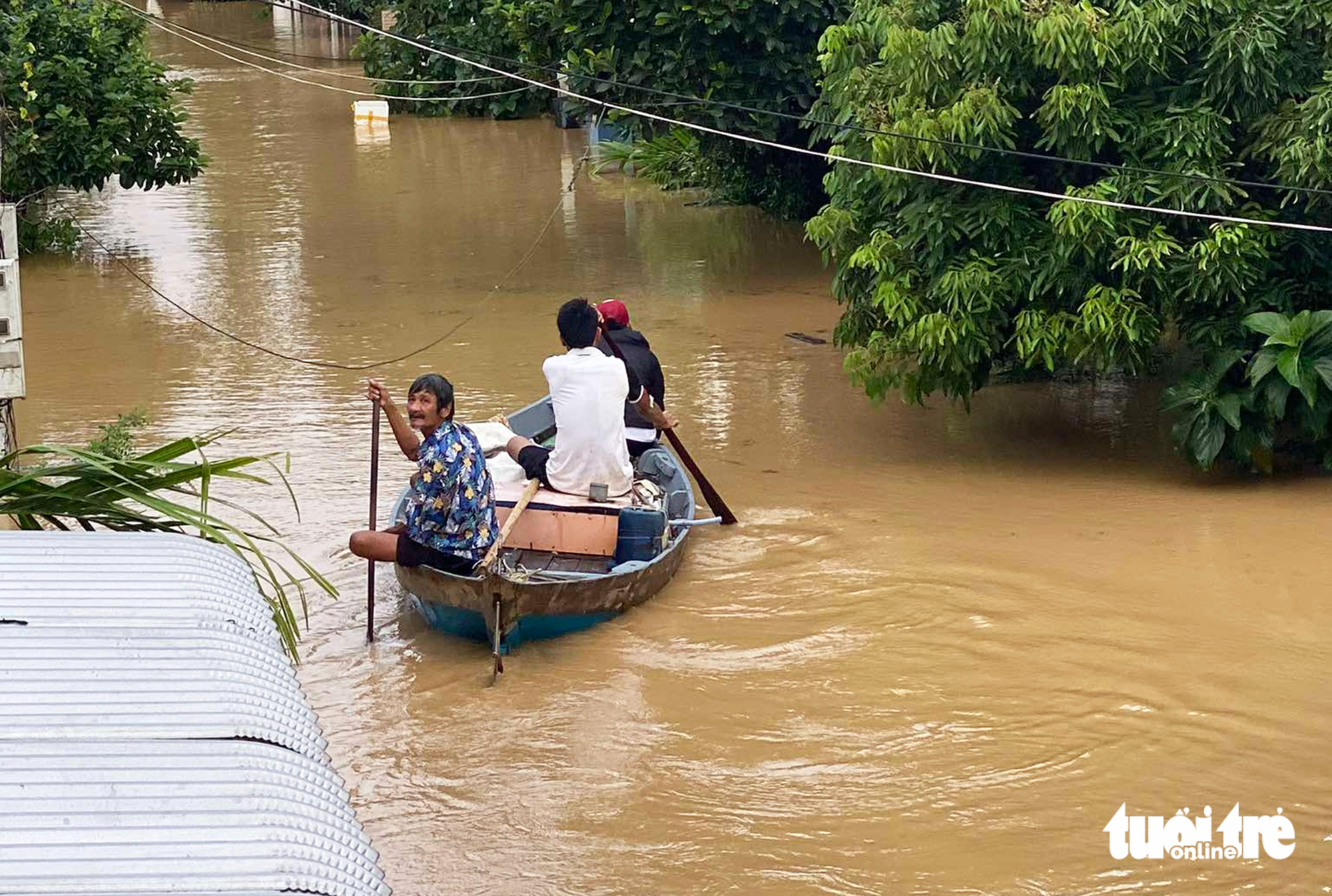 Người dân bị cô lập phải đi chuyển bằng ghe - Ảnh: TRƯỜNG TRUNG