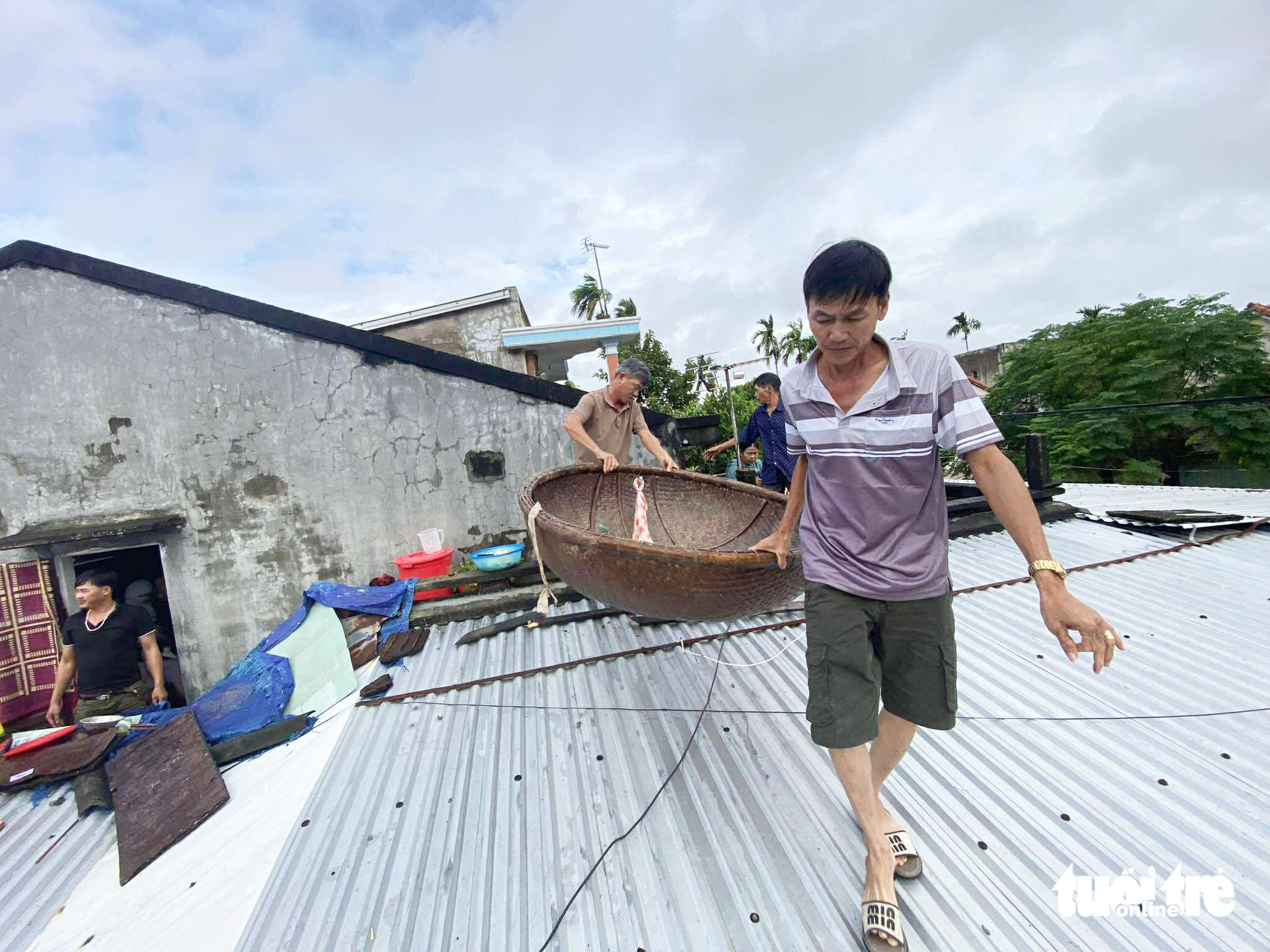 Người dân khiêng thúng chai lên mái nhà để di chuyển trong lũ - Ảnh: CÔNG TÂM