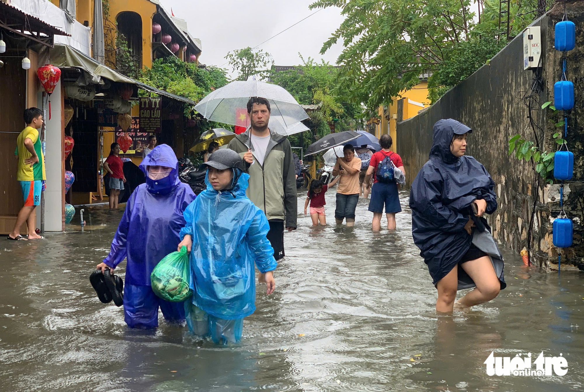 Du khách rời khỏi vùng ngập sâu ở Hội An - Ảnh: THANH NGUYÊN