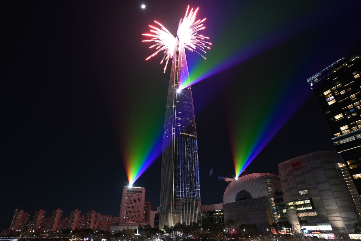 Pháo hoa thắp sáng bầu trời đêm phía trên tòa tháp Lotte World Tower, tòa nhà cao nhất Hàn Quốc ở Seoul, trong lễ đón năm mới rạng sáng 1-1-2026 (giờ địa phương) - Ảnh: AFP