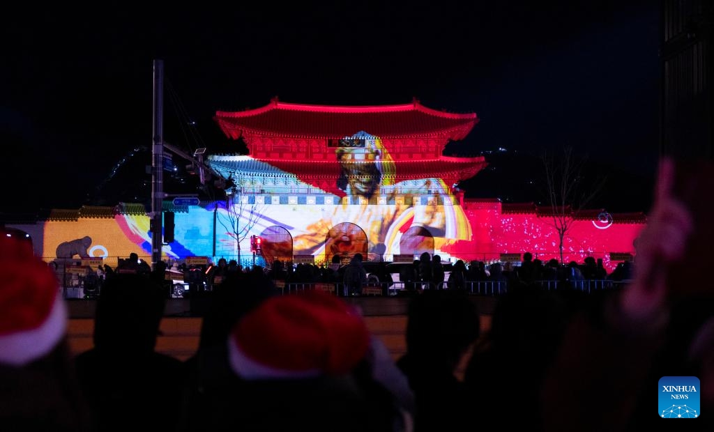 Người dân thưởng thức màn trình diễn ánh sáng đón năm mới tại Seoul, Hàn Quốc ngày 31-12-2025 - Ảnh: XINHUA