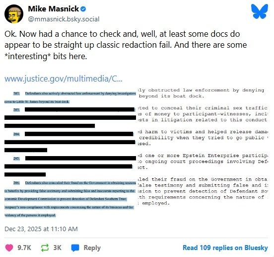 Một bài đăng về mẹo copy - paste để đọc được nội dung bôi đen trong một tài liệu liên quan đến hồ sơ Epstein - Ảnh: BLUESKY