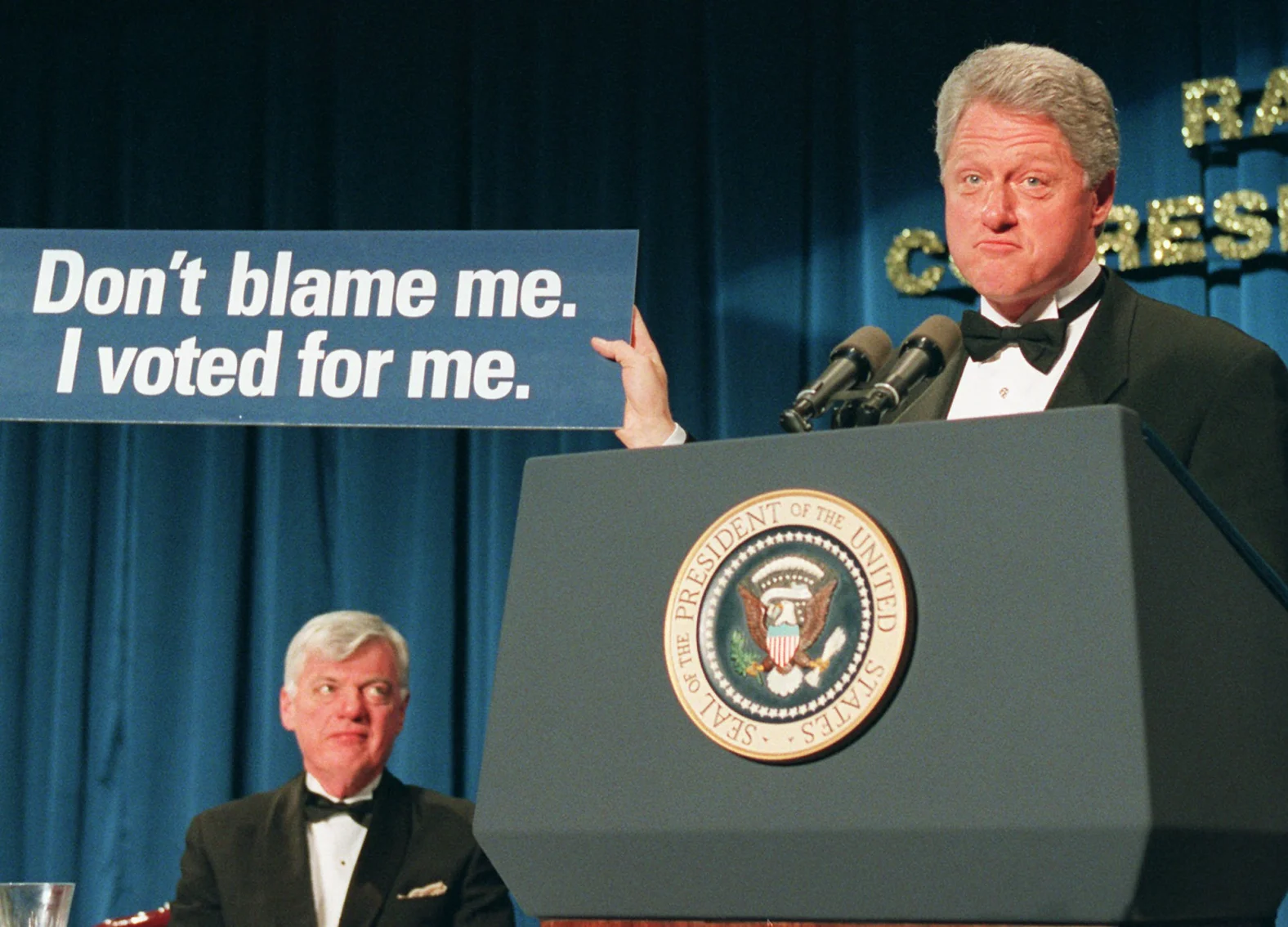 Tổng thống Bill Clinton cầm một tấm biển ghi "Đừng đổ lỗi cho tôi. Tôi đã bỏ phiếu cho chính mình" tạo tràng cười vui vẻ tại dạ tiệc năm 1996 - Ảnh: AP