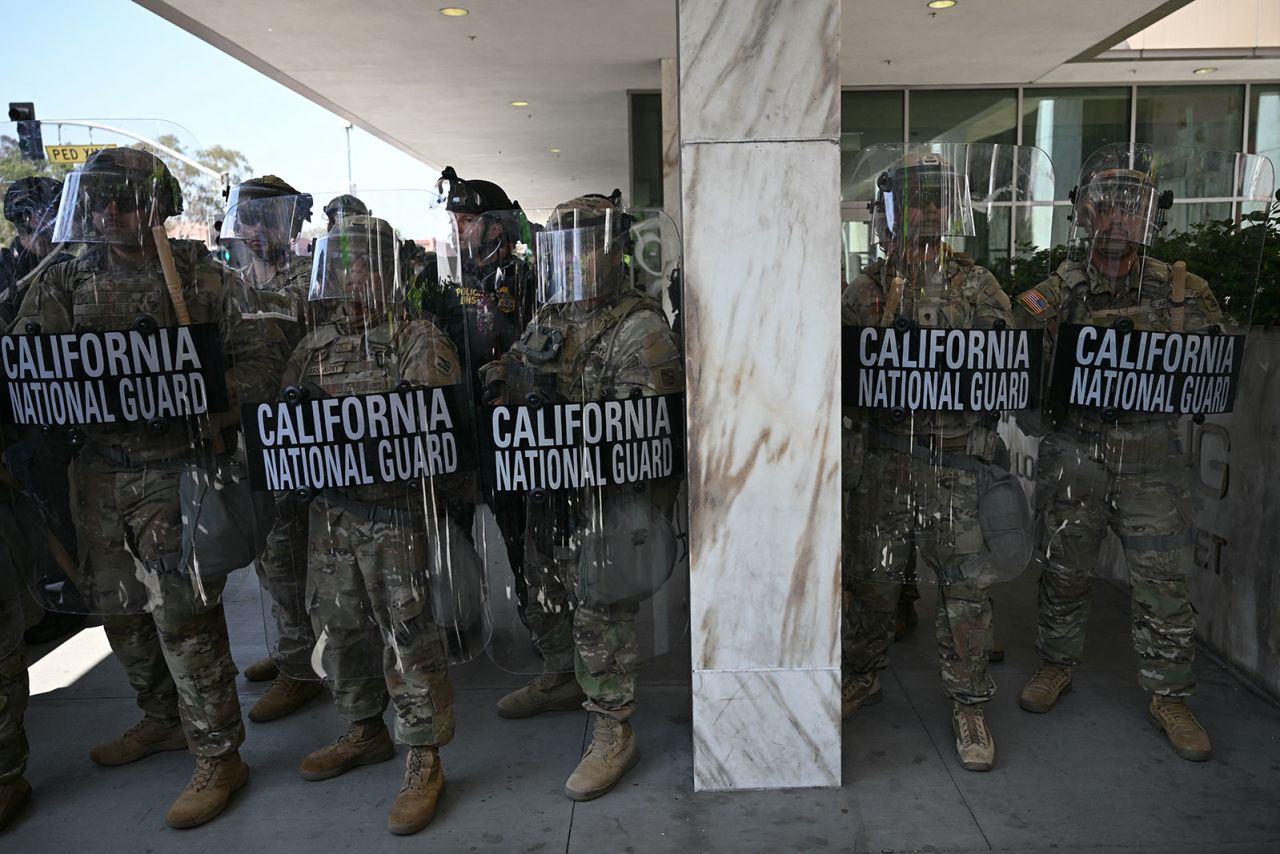 Lực lượng Vệ binh Quốc gia California đứng gác bên ngoài tòa nhà liên bang ở Los Angeles hôm 9-6 - Ảnh: AFP