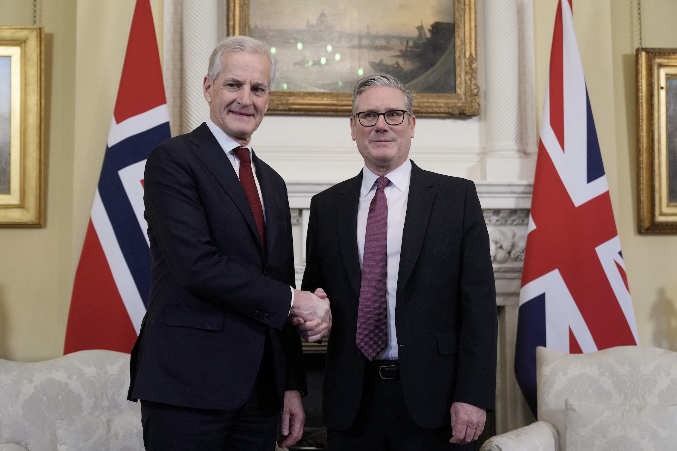 Thủ tướng Anh Keir Starmer bắt tay với Thủ tướng Na Uy Jonas Gahr Store trong cuộc gặp tại thủ đô London ngày 4-12 - Ảnh: AFP