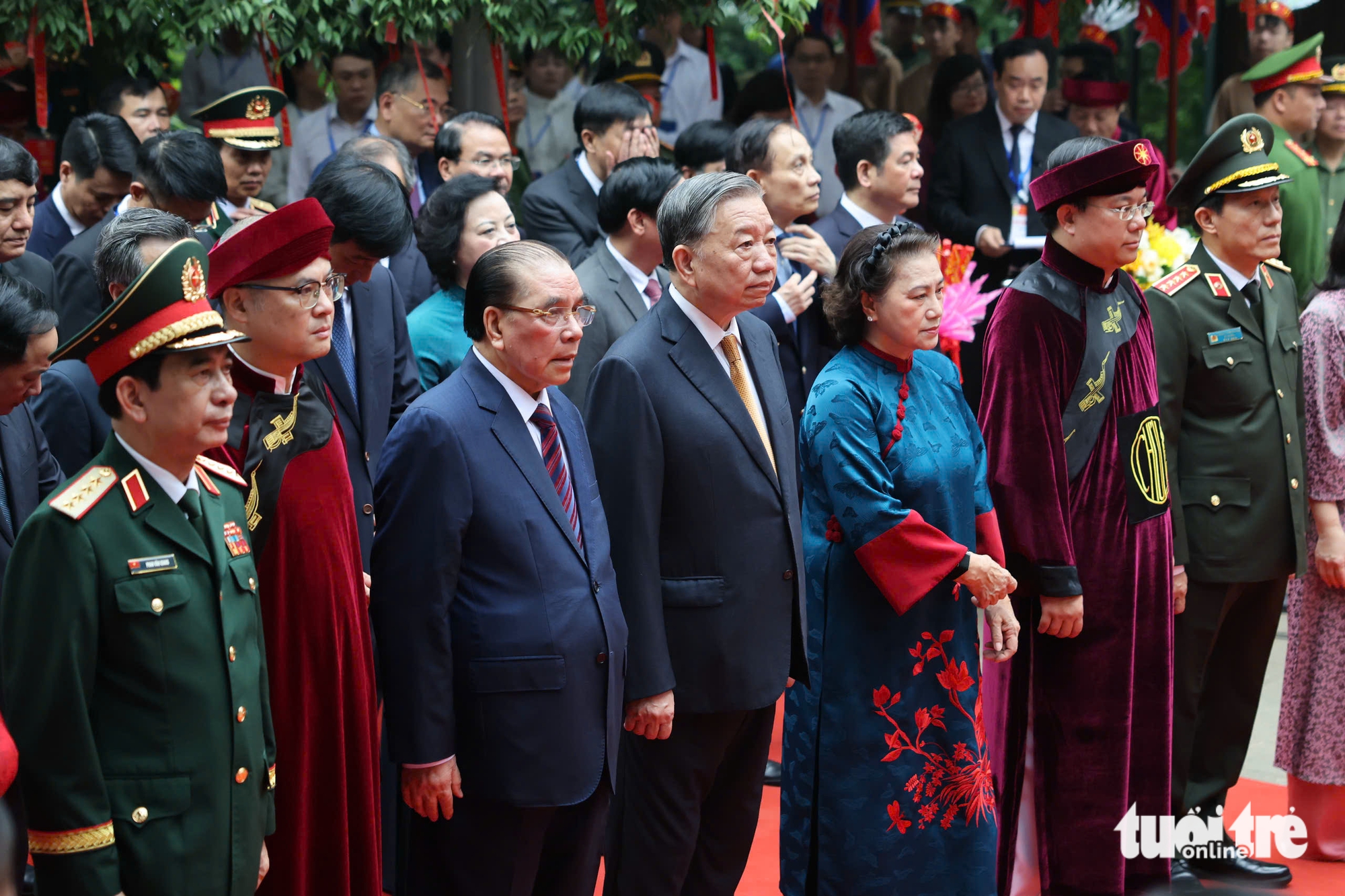 Tổng Bí thư, Chủ tịch nước Tô Lâm, nguyên Tổng Bí thư Nông Đức Mạnh, nguyên Chủ tịch Quốc hội Nguyễn Thị Kim Ngân và lãnh đạo Đảng, Nhà nước đến đền Thượng - Ảnh: NGUYỄN KHÁNH