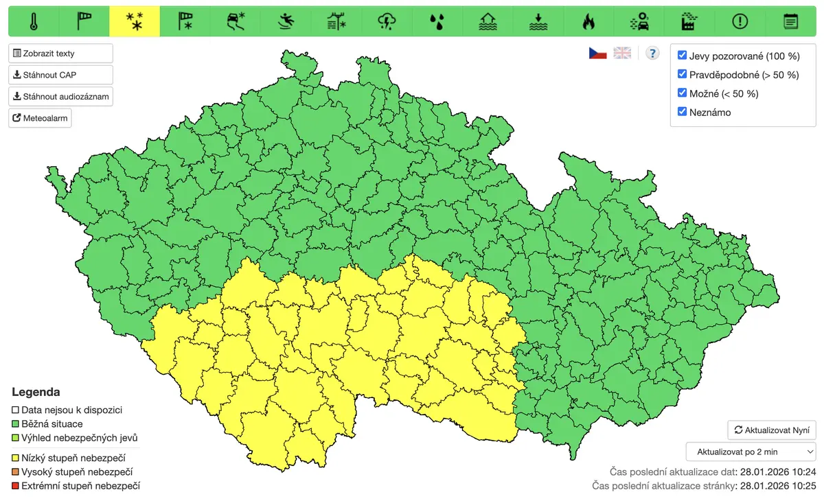 Cảnh báo có hiệu lực từ 2 giờ sáng đến 5 giờ chiều thứ Năm cho toàn bộ vùng Vysočina và Jihočeský, cũng như một số khu vực của vùng Plzeňský, Středočeský và Jihomoravský.