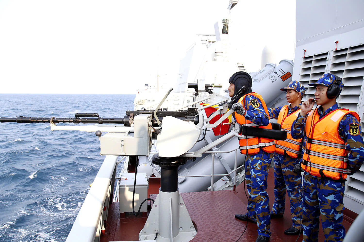 Xạ thủ súng 14,5 ly trên tàu 015 thực hành bắn đạn thật trong khoa mục chống cướp biển