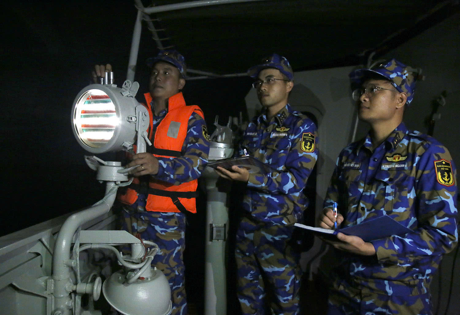 Sĩ quan, thủy thủ biên đội tàu 015, 012 thực hiện khoa mục thông tin ánh đèn